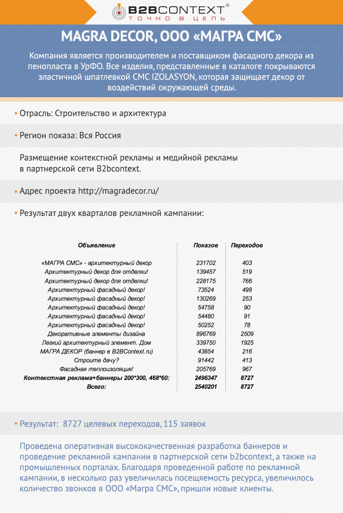 Проведена оперативная высококачественная разработка баннеров и проведение рекламной кампании в партнерской сети b2bcontext, а также на промышленных порталах. Благодаря проведенной работе по рекламной кампании, в несколько раз увеличилась посещяемость ресурса, увеличилось количество звонков в ООО «Магра СМС», пришли новые клиенты.